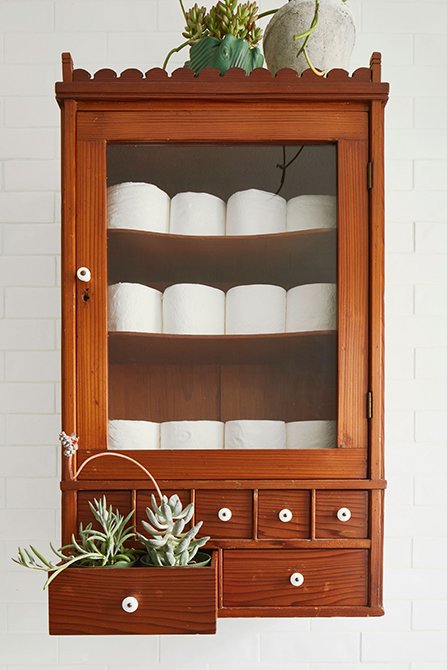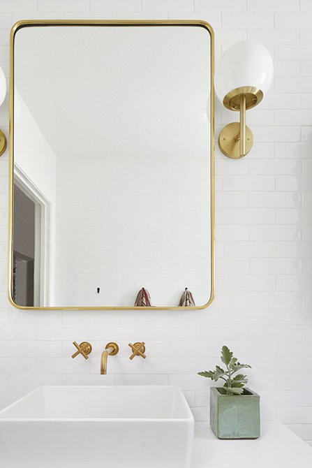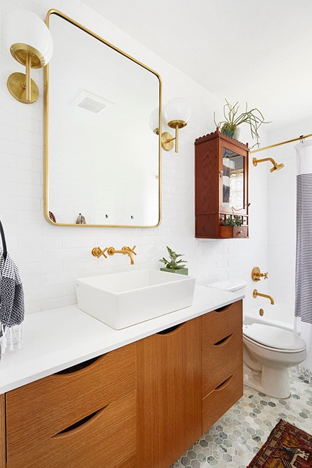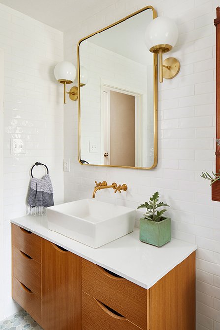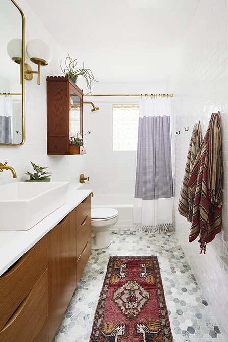 The marble hexagonal floor tile from Floor and Decor adds visual contrast against the floor-to-ceiling subway tile, which was a budget-friendly find from a local Home Depot. The purposeful reflectivity of the subway tile opens up the space and creates the perfect backdrop for a gorgeous custom white oak vanity. The warm wood accents are complemented by a secondary storage cabinet positioned above the toilet, providing a fun little space for storing toilet paper rolls. This cabinet was a rare find from Suzanna's annual pilgrimage to the Round Top Vintage Antique Fair. Brass wall sconces from Cedar and Moss coordinate seamlessly with an oversized matching mirror from Rejuvenation, while faucets were chosen from the Kohler Purist line. To add both texture and softness, a colorful vintage Persian rug was included, along with Turkish towels from Odd Bird and a shower curtain from Target, completing the final design layering. The result is an upscale and kid-friendly space that brims with character and quality.