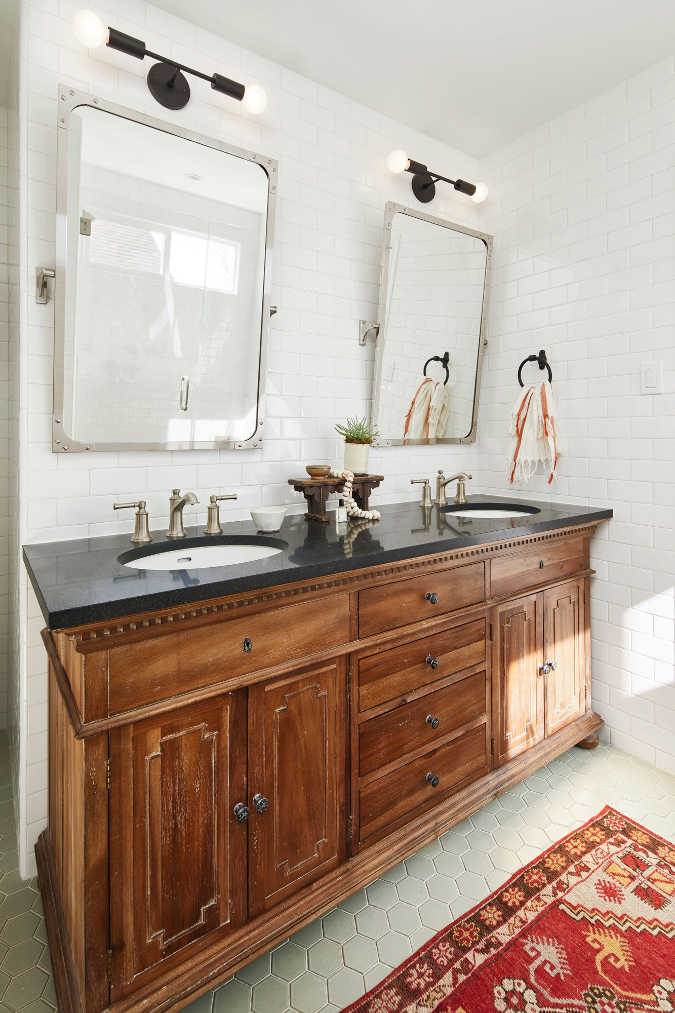 Three severely outdated bathrooms were overhauled for a creative client whose vintage collections inspired bright and quirky design touches, linked thoughtfully to the rest of the home.